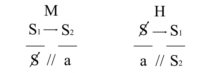 En la imagen que antecede a este párrafo[1] están presentados comparativamente los discursos del Amo y de la Histérica, simbolizados con una M y una H, respectivamente. Cada discurso está estructurado con las mismas cuatro posiciones (agente, trabajo, producción y verdad), pero en cada uno de ellos hay una distribución de elementos (S1, S2, a, $) distinta de acuerdo con el carácter o semblante que se asigne. Por último, cada discurso comparte una dinámica en la que opera: se dibuja un círculo hacia la derecha que inicia con la posición superior izquierda y que se detiene al toparse con las barras dobles que representan la imposibilidad.